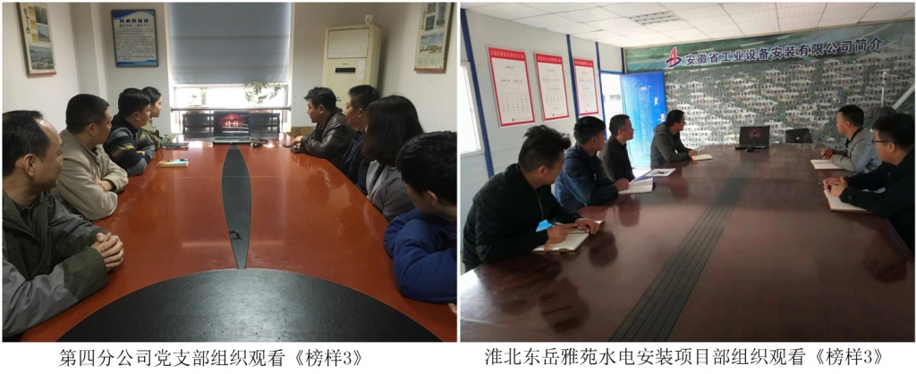 為深入學(xué)習(xí)貫徹習(xí)近平新時(shí)代中國特色社會(huì)主義思想和黨的十九大精神,深入推進(jìn)“兩學(xué)一做”學(xué)習(xí)教育常態(tài)化制度化,樹立優(yōu)秀共產(chǎn)黨員楷模,發(fā)揮先進(jìn)典型示范作用,按照《中共安徽省委組織部關(guān)于認(rèn)真做好<榜樣3>專題節(jié)目學(xué)習(xí)宣傳工作的通知》要求,近日,安徽安裝公司組織各黨支部、項(xiàng)目部黨員干部職工集中觀看《榜樣3》專題節(jié)目。