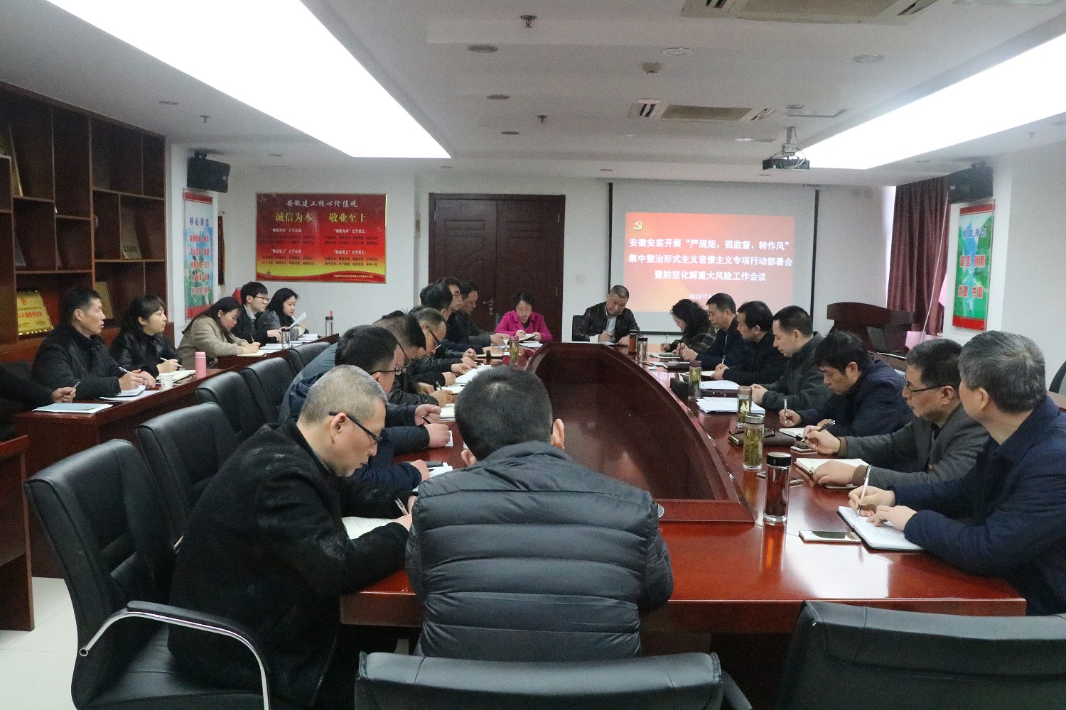 3月11日上午,安徽安裝公司組織召開“嚴(yán)規(guī)矩、強(qiáng)監(jiān)督、轉(zhuǎn)作風(fēng)”集中整治形式主義官僚主義專項(xiàng)行動(dòng)部署會(huì)暨防范化解重大風(fēng)險(xiǎn)工作會(huì)議。公司黨委書記、董事長(zhǎng)胡六中主持會(huì)議,公司領(lǐng)導(dǎo)、機(jī)關(guān)部門負(fù)責(zé)人、分公司黨政主要領(lǐng)導(dǎo)等共30余人參加會(huì)議。