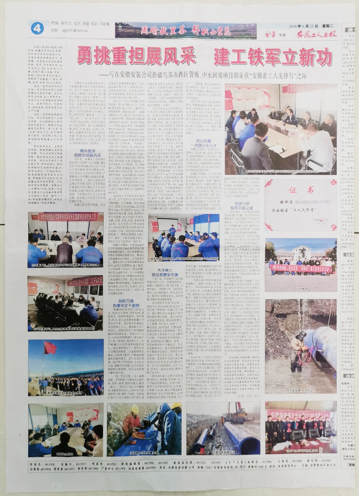 先進典型是時代精神的標桿,典型事跡報道是擴大傳播力的有效法寶。近日,《安徽工人日報》在風(fēng)采專版的顯著位置以《勇挑重擔(dān)展風(fēng)采,建工鐵軍立新功》為題刊發(fā)整版專題報道,記述安徽安裝新疆烏蘇市西區(qū)管廊、中水回用項目部榮獲“安徽省工人先鋒號”的典型事跡以及項目部團隊的幕后故事。