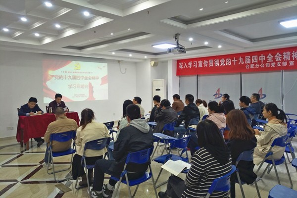 為深入學(xué)習(xí)宣傳貫徹黨的十九屆四中全會(huì)精神,打牢政治基礎(chǔ),堅(jiān)定政治方向,11月13日下午3點(diǎn),合肥分公司黨支部在公司十五樓職工之家組織召開黨的十九屆四中全會(huì)精神學(xué)習(xí)專題會(huì),分公司領(lǐng)導(dǎo)班子成員、機(jī)關(guān)全體黨員干部及在肥項(xiàng)目部人員參加了會(huì)議,會(huì)議由黨支部書記胡迎東主持。