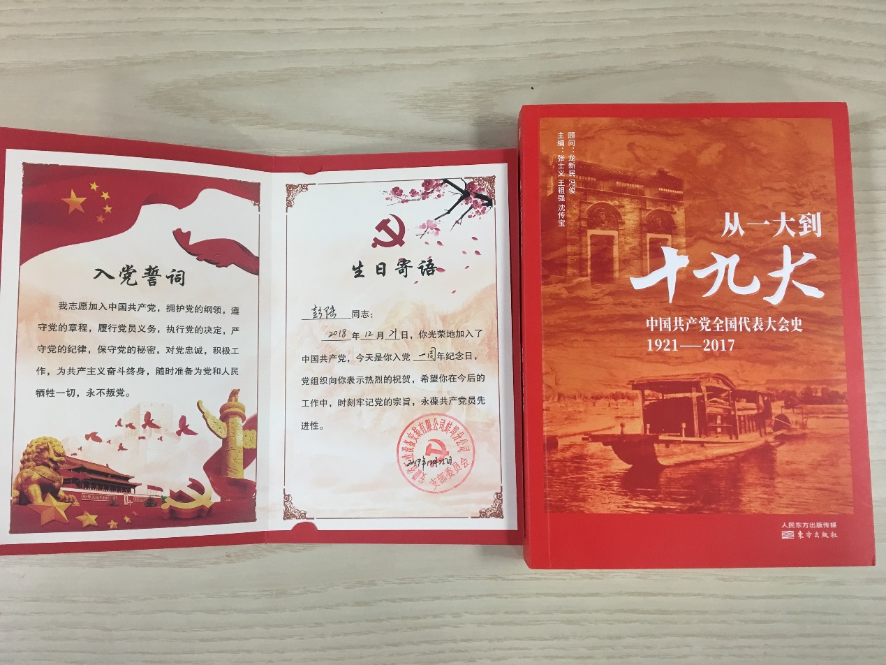 會上,黨支部書記程茂麗首先宣讀了12月份過政治生日的黨員名單,接著分別向他們贈送“政治生日”賀卡和《從一大到十九大》書籍禮物。隨后,黨員彭陸同志結(jié)合自己入黨一年來的歷程發(fā)表了生日感言,與大家分享加入黨組織以來成長歷程的點點滴滴,并結(jié)合本職工作,展望未來工作,牢記使命擔(dān)當(dāng)。