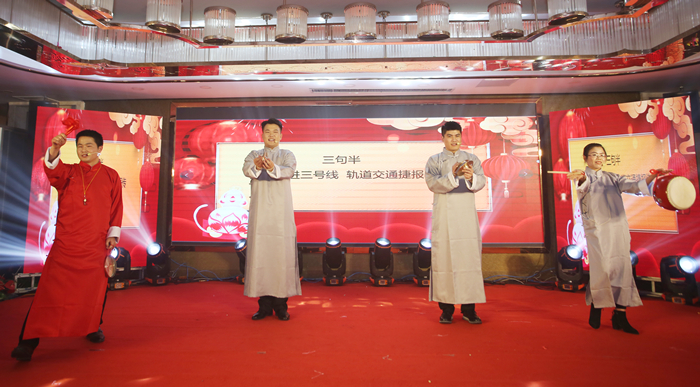 整場聯(lián)歡會(huì)由歌伴舞、朗誦、合唱、小品、樂器演奏、三句半、黃梅戲、音詩畫等16個(gè)節(jié)目組成,均為職工自編自導(dǎo)自演。在歌伴舞《今天是你的生日中》中,聯(lián)歡會(huì)正式拉開序幕?!妒“操潯芬愿木幇纥S梅戲劇的形式為公司送上美好的祝愿;配樂詩朗誦《春風(fēng)浩蕩啟新程,揚(yáng)帆起航再出發(fā)》展現(xiàn)了安徽安裝人團(tuán)結(jié)奮進(jìn),一往無前的精神風(fēng)貌;三句半《拼搏奮進(jìn)三號線,軌道交通捷報(bào)傳》以幽默的方式講述了軌道交通3號線合肥大劇院站項(xiàng)目部上的故事;音詩畫《奮斗是青春最亮麗的底色》講述了新疆烏蘇管廊、中水回用項(xiàng)目榮獲“安徽省工人先鋒號”背后的故事,向全體奮戰(zhàn)在項(xiàng)目施工一線的安徽安裝人致敬...歡快的旋律,優(yōu)美的舞姿,幽默的小品,豪邁的朗誦將現(xiàn)場的氣氛推向高潮,贏得了現(xiàn)場觀眾的歡呼喝彩與陣陣掌聲。