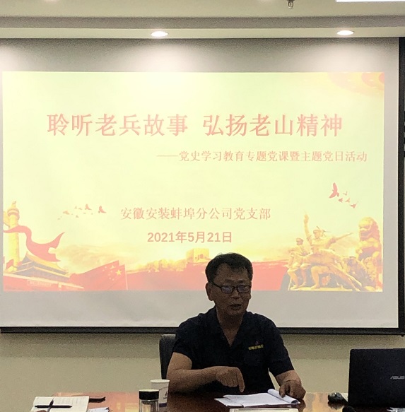 為深入開展黨史學(xué)習(xí)教育活動,進(jìn)一步引導(dǎo)黨員干部學(xué)習(xí)黨史、銘記黨史,5月21日下午,蚌埠分公司黨支部組織開展了一場“聆聽老兵故事 弘揚(yáng)老山精神”黨史學(xué)習(xí)教育專題黨課暨主題黨日活動。邀請?jiān)鴧⒓舆^對越自衛(wèi)反擊戰(zhàn)的退伍老兵,分公司在職員工年飛同志為大家上了一堂別開生面的黨課。分公司班子成員、項(xiàng)目經(jīng)理、部門負(fù)責(zé)人及全體黨員參會。