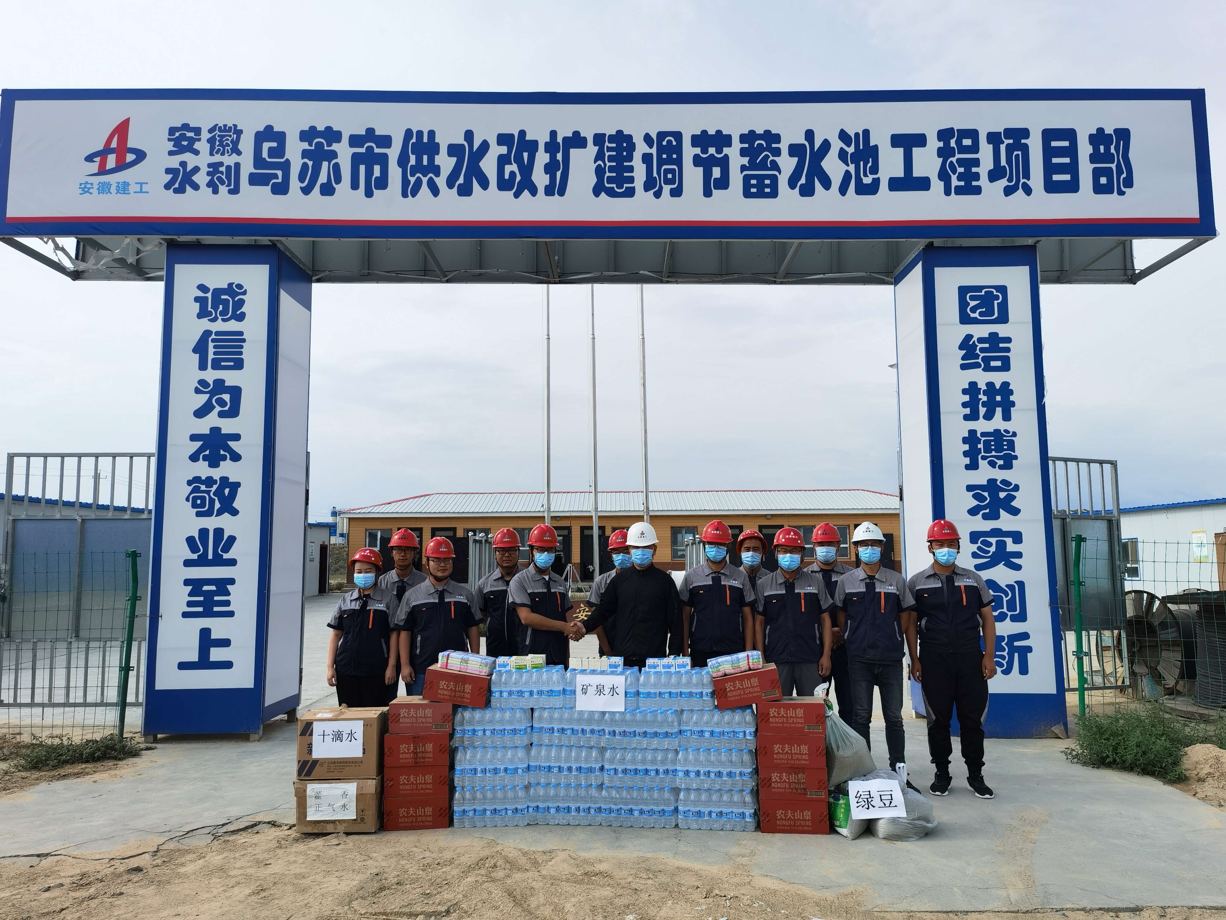 2021年7月14日上午,公司副總經(jīng)理王軍赴烏蘇市供水改擴(kuò)建調(diào)節(jié)蓄水池項(xiàng)目“送清涼”,將礦泉水、綠豆、冰糖、藿香正氣水、十滴水、毛巾、香皂等防暑降溫物品送到一線員工手中。