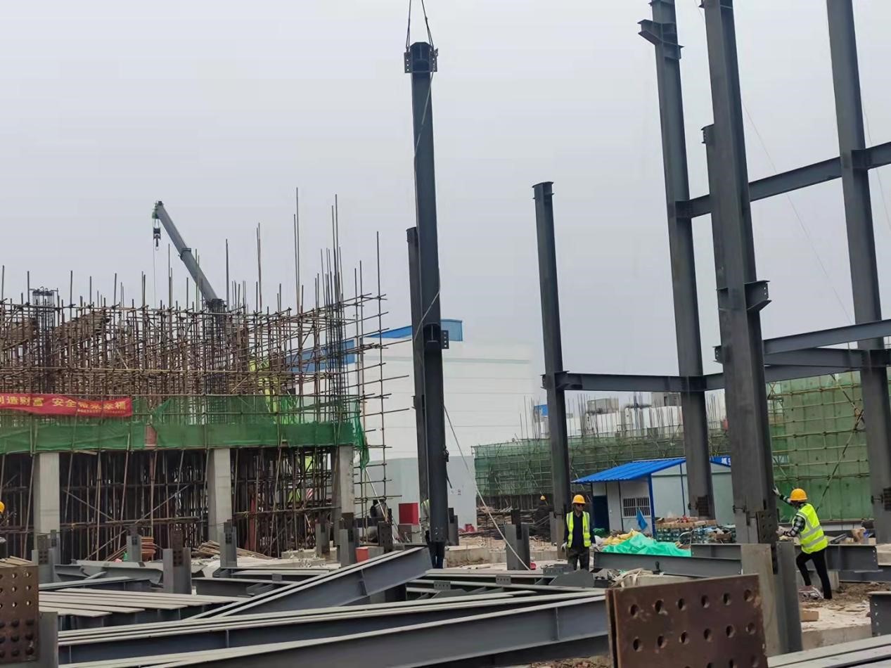 發(fā)酵車間C區(qū)鋼結構區(qū)域,吊裝作業(yè)正在如火如荼進行;B區(qū)滿堂腳手架緊張搭設,鋼筋工頂著烈日進行鋼筋綁扎,投料車間兩臺挖機聯(lián)動,進行管廊支架基礎基坑開挖,控制車間正在忙忙碌碌進行內(nèi)墻二次結構砌筑。各個車間有條不紊的忙碌著,整個項目現(xiàn)場一片火熱,迅速掀起“比、學、趕、幫、超”施工高潮!