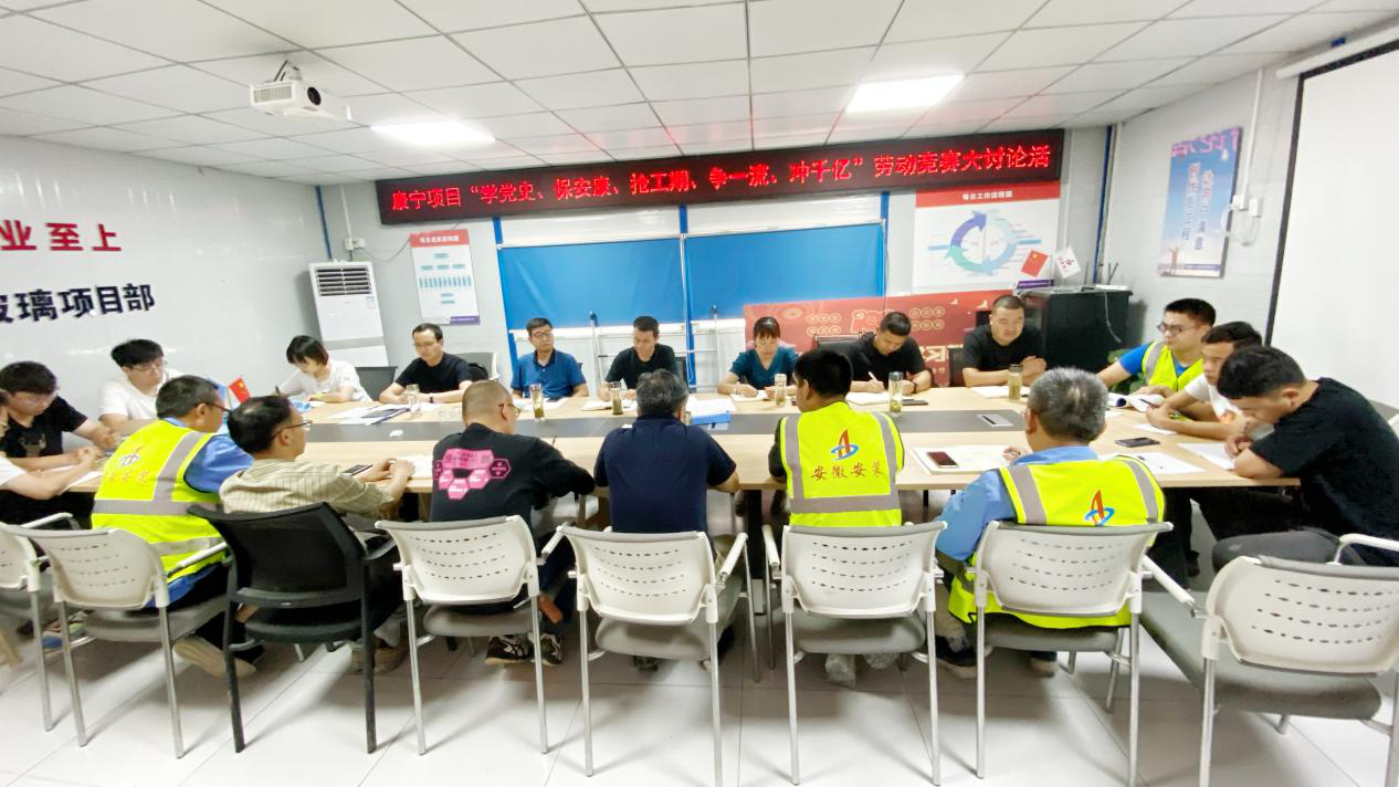 為貫徹落實集團公司“學黨史、保安康、搶工期、爭一流、沖千億”主題勞動競賽活動精神,6月29日上午,安徽安裝公司在蚌埠康寧項目部會議室開展“學黨史、保安康、搶工期、爭一流、沖千億,大干60天,確保完成節(jié)點目標”的勞動競賽大討論活動。公司副總經(jīng)理劉安俊,公司紀委書記、工會主席李寬旭,公司工程管理部經(jīng)理龍海健,蚌埠分公司領導班子成員,康寧項目部人員等30人參加了會議,會議由李寬旭主持。
