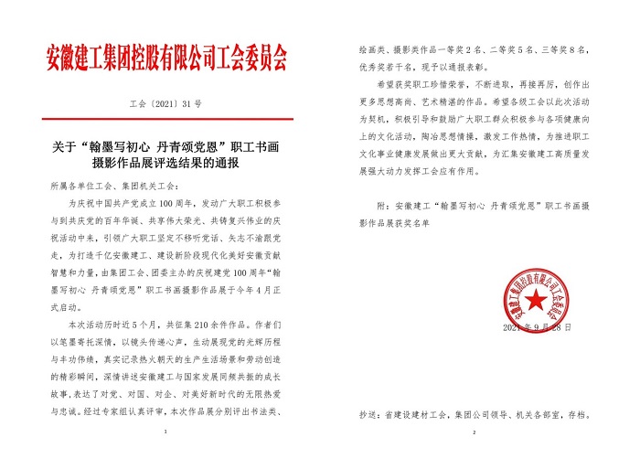 9月29日,集團(tuán)公司工會(huì)通報(bào)了“翰墨寫(xiě)初心 丹青頌黨恩”職工書(shū)畫(huà)攝影作品展評(píng)選結(jié)果,安徽安裝公司選送的五幅作品榜上有名。其中馬金鑫的油畫(huà)作品《支部建在項(xiàng)目上》榮獲繪畫(huà)類(lèi)一等獎(jiǎng),任禹豪的攝影作品《幸福是干出來(lái)的》榮獲攝影類(lèi)二等獎(jiǎng),化范寶的硬筆書(shū)法作品《沁園春·雪》和程茂麗的攝影作品《攀登》、胡欣欣的攝影作品《齊心》分別榮獲書(shū)法類(lèi)優(yōu)秀獎(jiǎng)和攝影類(lèi)優(yōu)秀獎(jiǎng)。