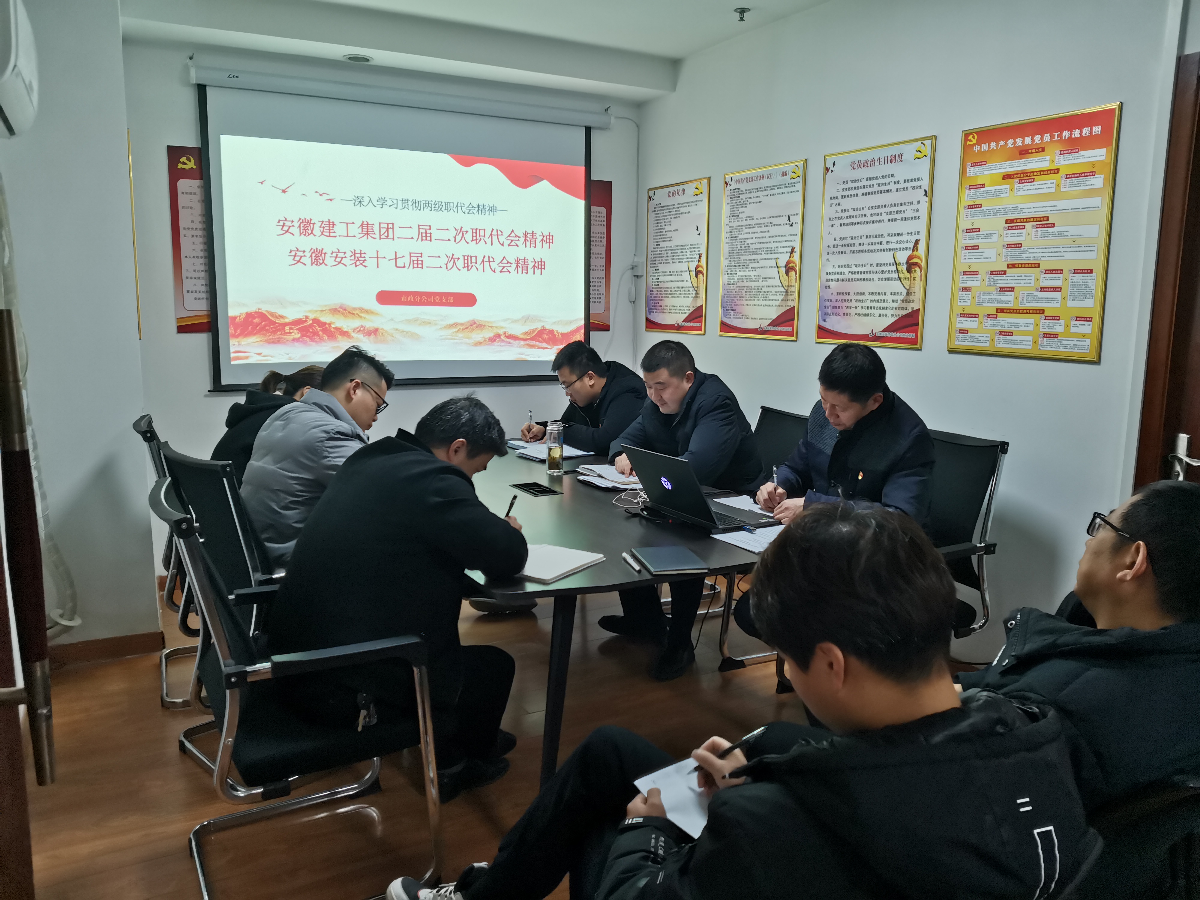 1月28日上午,市政分公司召開專題學(xué)習(xí)會,傳達(dá)學(xué)習(xí)集團(tuán)二屆二次職代會暨2022年工作會議精神和公司第十七屆二次職代會精神,分公司全體員工參加了會議,會議由分公司黨支部書記胡迎東主持,