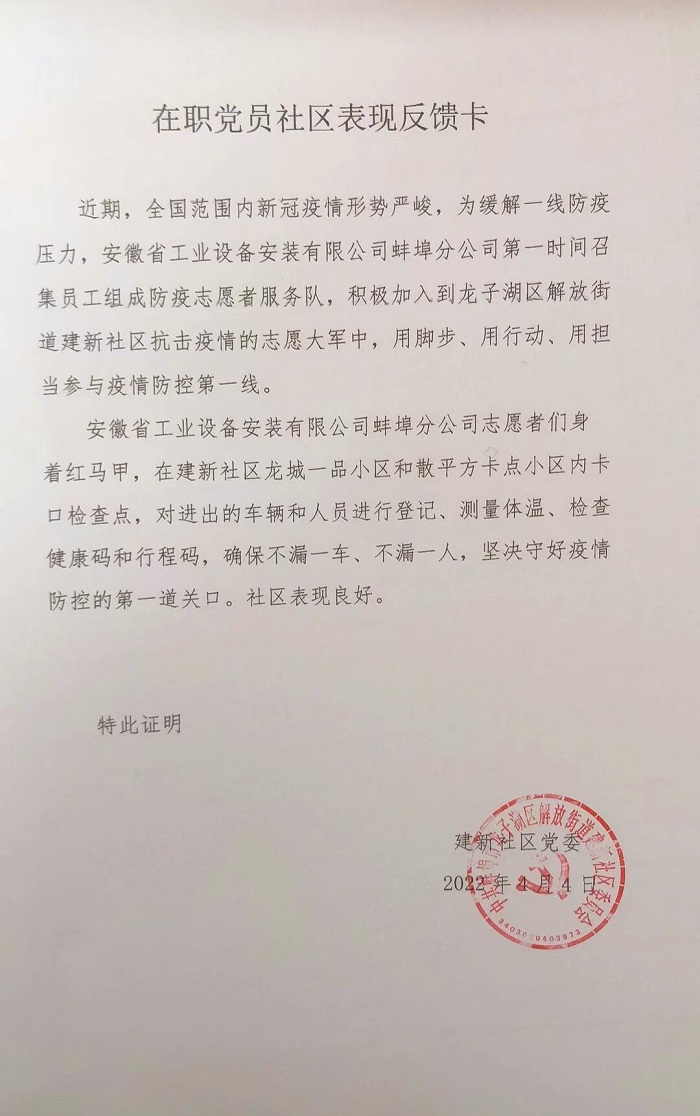 通過本次活動(dòng),志愿者們用實(shí)際行動(dòng)踐行了初心和使命,展現(xiàn)了安徽安裝志愿者飽滿的精神風(fēng)貌。建新社區(qū)黨委表達(dá)了對(duì)于安徽安裝公司的真誠(chéng)感謝,期間社區(qū)及時(shí)通過微信公眾號(hào)對(duì)安徽安裝積極擔(dān)當(dāng)社會(huì)責(zé)任予以報(bào)道,有效擴(kuò)大了企業(yè)影響力,樹立了良好企業(yè)形象。