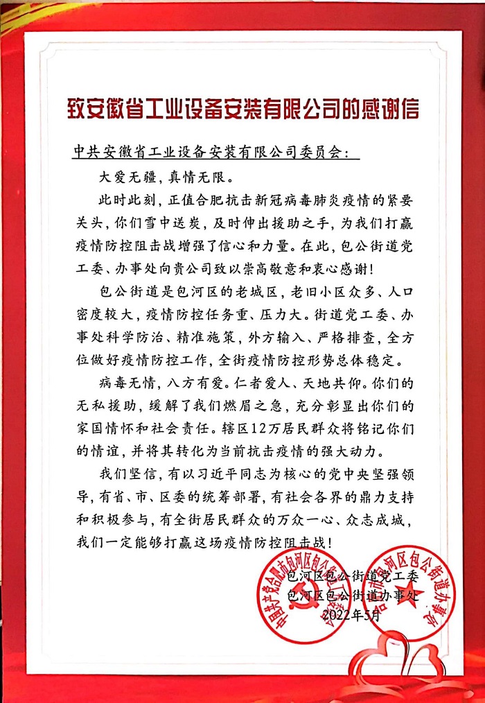 近日,包河區(qū)包公街道街道黨工委委員,辦事處副主任劉亮,包河區(qū)包公街道炳輝社區(qū)黨委書記房磊給安徽安裝公司送來了感謝信,信中表達(dá)了對安徽安裝公司在合肥抗擊新冠病毒肺炎疫情急要關(guān)頭迎難而上、勇于擔(dān)當(dāng),積極支援疫情防控的感激之情。
