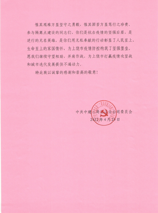 信中對(duì)安徽安裝公司與中建二局浙江分公司共同援建上饒市人民醫(yī)院北城區(qū)集中隔離點(diǎn)給予高度的肯定和認(rèn)可。當(dāng)前,新冠疫情形勢(shì)嚴(yán)峻,安徽安裝公司在嚴(yán)格落實(shí)屬地疫情防控措施的同時(shí),一方面積極參與本地區(qū)隔離點(diǎn)、醫(yī)院發(fā)熱門診的緊急建設(shè)任務(wù);另一方面攜手相關(guān)行業(yè)兄弟單位同心協(xié)力、援建市外防疫區(qū)域,承擔(dān)起國有企業(yè)社會(huì)責(zé)任,竭盡所能地為防疫建設(shè)貢獻(xiàn)最大的力量!