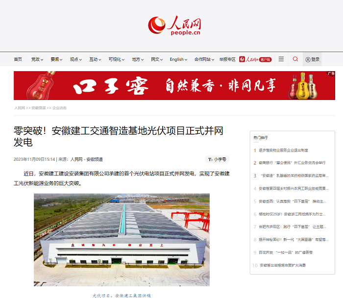 近日,人民網(wǎng)專題報道公司承建的首個光伏電站項目正式并網(wǎng)發(fā)電,實現(xiàn)了安徽建工光伏新能源業(yè)務(wù)的巨大突破。