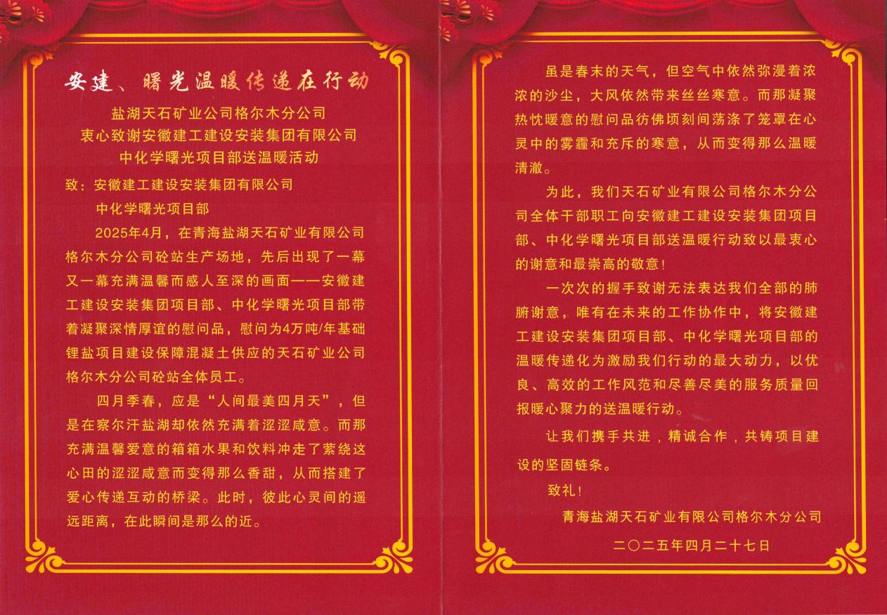 信中,青海鹽湖天石礦業(yè)有限公司格爾木分公司對(duì)建工安裝項(xiàng)目部此前慰問砼站全體員工致以最誠摯的感謝,愿繼續(xù)與建工安裝項(xiàng)目部攜手共進(jìn)、精誠合作、再創(chuàng)佳績!這封感謝信不僅是對(duì)項(xiàng)目部過往成績的肯定,更是一份振奮人心的激勵(lì)。建工安裝將繼續(xù)保持高昂斗志和嚴(yán)謹(jǐn)態(tài)度,加強(qiáng)與相關(guān)單位溝通協(xié)作,強(qiáng)化項(xiàng)目管理,確保項(xiàng)目按期、高質(zhì)量交付,為打造世界級(jí)鹽湖提鋰產(chǎn)業(yè)基地貢獻(xiàn)力量!