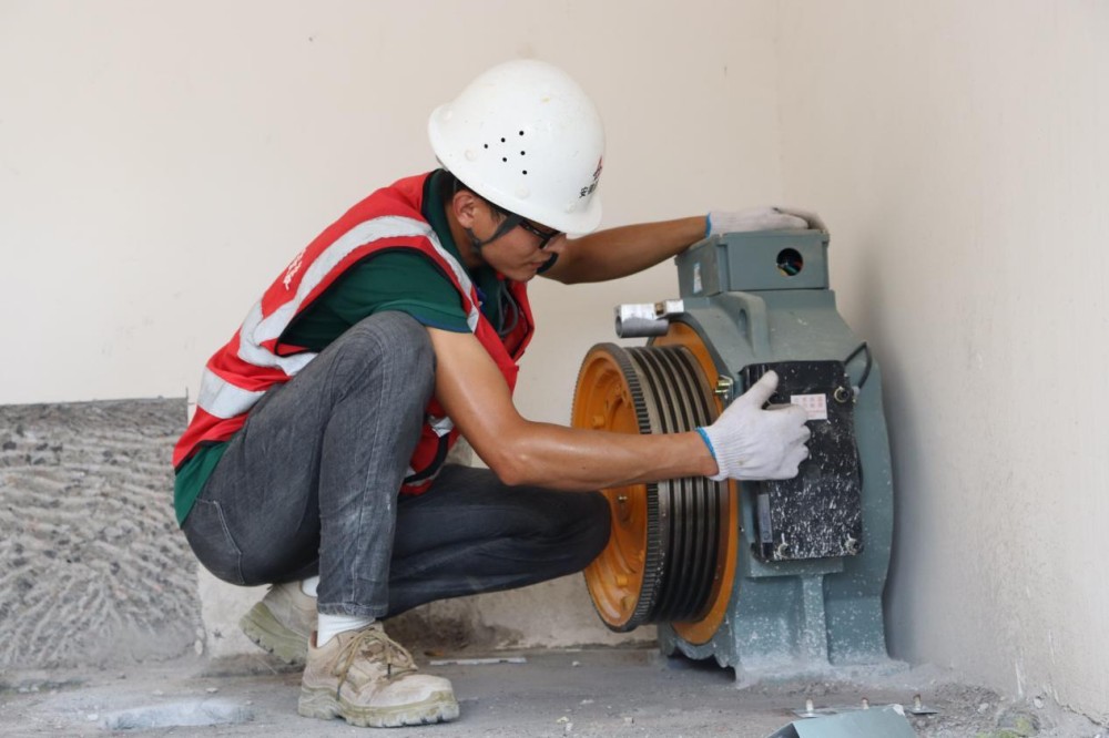 桃花科創(chuàng)產(chǎn)業(yè)園EPC項(xiàng)目施工人員正在調(diào)試電梯主機(jī)平衡度
