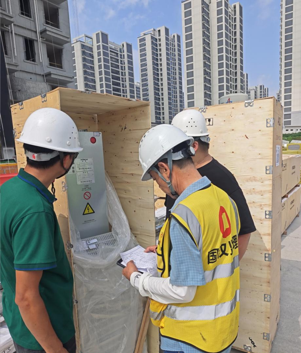 長(zhǎng)豐縣雙墩鎮(zhèn)紫桐苑項(xiàng)目項(xiàng)目管理人員正在對(duì)電梯開箱核對(duì)數(shù)據(jù)參數(shù)