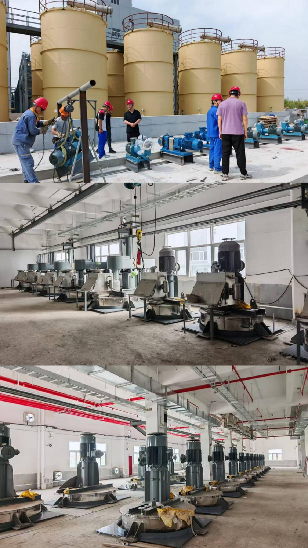 在馬鞍山采石磯項(xiàng)目現(xiàn)場(chǎng)可見大型儲(chǔ)罐等設(shè)施矗立,施工人員開展設(shè)備安裝等作業(yè),指揮調(diào)度清晰有序,各項(xiàng)操作體現(xiàn)專業(yè)素養(yǎng)。在車間內(nèi)部,一排排新設(shè)備整齊排列,部分設(shè)備已精準(zhǔn)安裝就位,施工環(huán)境整潔規(guī)范,展現(xiàn)精細(xì)化管理水平。